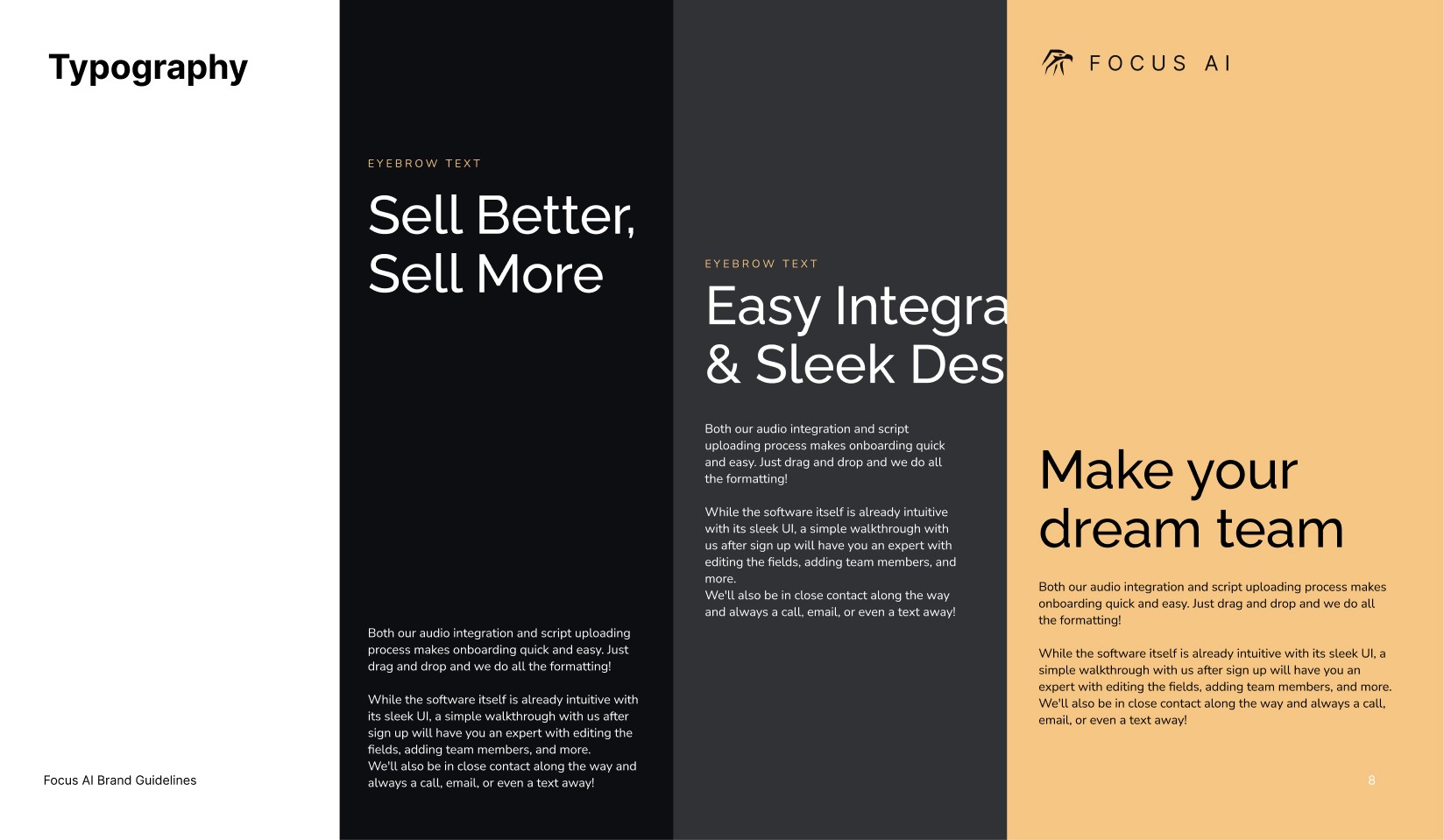 For Focus AI, I redesigned their website and developed a complete style guide with fresh colors and modern fonts. This project helped the co-founders relaunch their product with a stronger, more consistent visual identity. The new design ensures their brand feels cohesive and professional across every touchpoint.